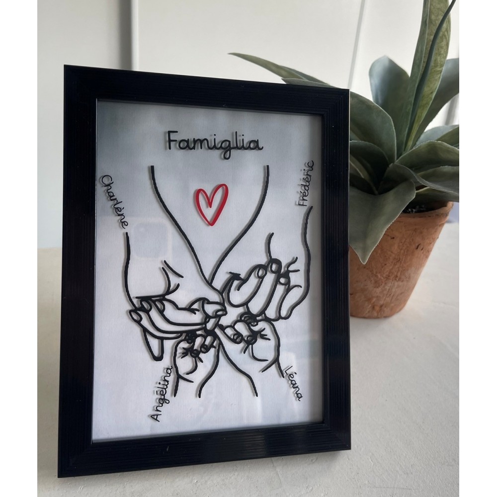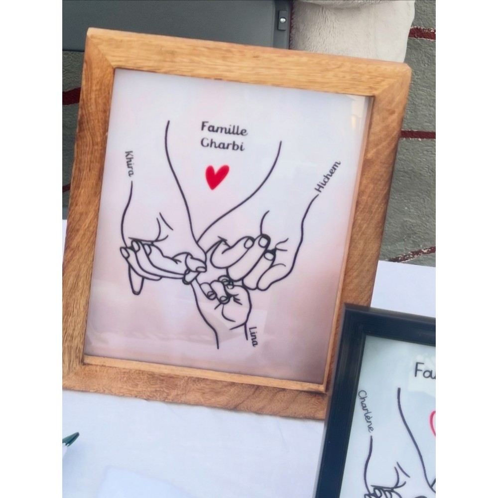 Symbolisez le lien unique qui unit votre famille avec ce cadre décoratif fabriqué à la main. Ce dessin épuré représentant les mains entrelacées des parents et des enfants est une façon élégante et moderne d'afficher votre amour au cœur de votre maison. C'est une création personnalisée qui s'adapte à la composition de votre foyer. Que ce soit pour offrir lors d'une fête des mères, des pères ou pour une naissance, ce cadre est une pièce forte et originale qui touche en plein cœur.