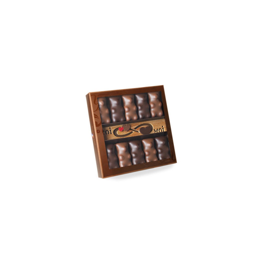 Ce coffret séduira les amateurs d'oursons en guimauve grâce à son assortiment irrésistible, enrobé à la perfection dans du chocolat noir ou du chocolat au lait. Pour rendre ce moment encore plus spécial, nous avons inclus une délicieuse plaque en chocolat blanc caramélisé, ornée d'une inscription "Toi /Moi" symbole d'un amour éternel.