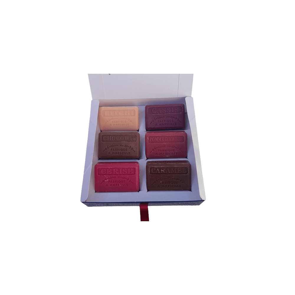 6 savons 125gr parfums litchi, cassis, chocolat, pomme d'amour, caramel, cerise