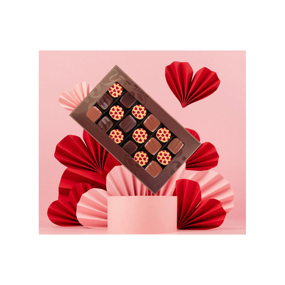 Coffret chocolat en assortiment de pralinés et de ganaches.