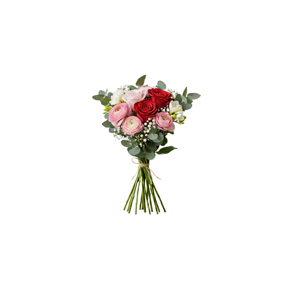 Des renoncules délicates aux pétales froissés, des roses tendres et quelques fleurettes légères se mêlent dans un joli camaïeu de rouges, roses et blancs. Le feuillage généreux vient structurer l'ensemble et lui donner de la profondeur, pour un rendu frais et naturel qui respire la spontanéité.